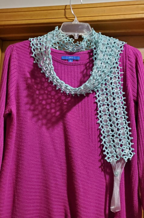 Adaptation of Molly's X Factor wrap (tatting with yarn, Tatted scarf with Berroco Pima Soft color 4618)- created just a scarf